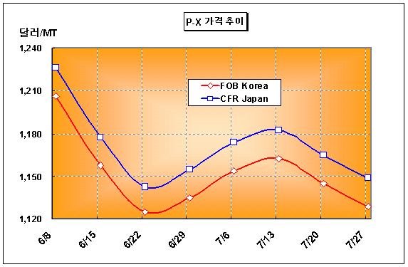 FOB Korea 1128달러 형성 … 7월 평균 CP는 CFR Asia 1130달러 P-X(Para-Xylene) 가격은 7월 넷째 주 FOB Korea 톤당 1128-1129달러로 17달러 떨어졌다.아시아 P-X 가격은 CFR SE Asis 톤당 6.75달러 하락해 1155-1160달러를 형성했다. 다운스트림인 PTA(Purified Terephthalic Acid) 시황이 부진함에 따라 구매량이 주춤해 가격 하락세를 견인한 것으로 해석된다. 중국에서는 60일 신용거래 기준으로 CFR China 톤당 1150달러 이하에 거래가 체결된 것으로 알려졌다. Shell은 9월 물량을 CFR Tiwan/Ulsan 톤당 1155달러에 제시했지만 거래는 체결되지 않은 것으로 나타났다.