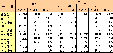 산자부, 7월 1-20일 21억달러 상회 … 원자재 수입액 20.9% 증가 7월 화학제품 수입이 30억달러에 육박한 것으로 추정된다.산업자원부가 발표한 <7월 수출입 동향>에 따르면, 7월 수입은 293억7000만달러로 전년동월대비 14.9% 증가했다. 수입품목 가운데 환율 하락과 완만한 소비 회복이 겹치면서 소비재 수입이 두드러져 2006년 7월 14.0%에 불과했던 수입 증가율이 7월에는 26.3%로 높아졌다. 또 철강금속(35.4%), 원유(3.4%) 수입이 늘어나면서 전체 원자재 수입액은 20.9% 증가했고, 자본재 역시 광학기기(73.7%), 전자부품(21.1%) 수입이 늘어나면서 전체적으로 14.3% 확대됐다.