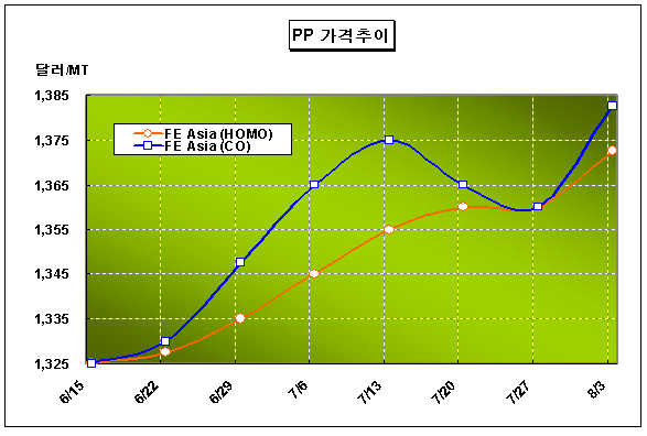 CFR FE Asia 1370-1375달러 … 중국 내수가격 낮아 하락세 우려 PP(Polypropylene) 가격이 8월 첫째주 CFR Fe Asia 톤당 1370달러를 돌파하며 고공행진을 이어가고 있다.PP Raffia/injection 그레이드 가격은 12.5달러 상승해 FE Asia 톤당 1370-1375달러, SE Asia 1370-1380달러까지 치솟았다. 미국산이 수개월째 아시아로 공급되지 못하고 있어 타이트 현상이 지속되고 있기 때문이다. 반면, 동남아시아 지역은 오름세 없이 상대적으로 높은 1430-1440달러 수준을 유지했으며, 중국의 내수가격도 1만2000-1만2100위안으로 변동이 없었던 것으로 나타났다. 하지만, 한때 중국의 PP 내수가격은 국제가격의 상승세와는 별개로 급격히 하락했던 것으로 알려졌다. 중국은 국제가격 강세의 지속 가능성에 대해 비관적이고, 200-300톤 수준의 상대적으로 적은 양의 PP 구매에만 관심을 보여 구매저조에 따른 가격하락 현상이 나타나고 있기 때문인 것으로 분석된다.