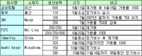 Asahi Kasei의 Mizushima 소재 32만톤 플랜트는 6월20일부터 5일간만 가동률 100%를 나타내고 감축했으며 15만톤 플랜트는 10월18일에 정기보수를 계획하고 있으며 39만톤 플랜트는 10월8일부터 11월14일까지 38일동안 정기보수를 실시할 계획이다. <이선애 기자> 표, 그래프: | 동아시아의 주요 SM 플랜트 가동현황(2007) | <화학저널 2007/08/07> |