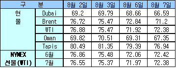 8월7일 2.07달러 하락 66.59달러 형성 … WTIㆍBrent는 상승 8월7일 국제유가는 미국 정유시설 가동차질로 인한 휘발유 수급불안 고조로 상승했다.한국석유공사에 따르면, 뉴욕상업거래소(NYMEX)의 WTI(서부텍사스 중질유) 선물유가는 전일대비 배럴당 0.36달러 상승한 72.42달러에, 런던석유거래소(ICE)의 Brent 선물유가는 0.63달러 상승한 71.80달러에 거래를 마감했다. Dubai 현물가격은 미국의 석유 수요가 감소될 것이라는 분석이 뒤늦게 반영되면서 2.07달러 하락한 66.59달러를 형성했다.