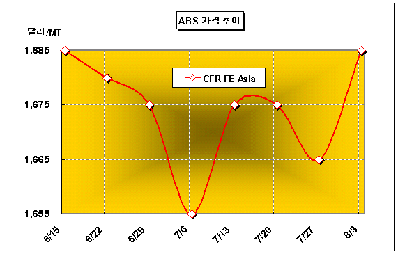 CFR FE Asia 1680-1690달러로 20달러 상승 … 1700달러 돌파 관건 ABS 가격은 8월 첫째 주 CFR FE Asia 톤당 1680-1690달러로 20달러 올랐다.ABS(Acrylonitrile Butadiene Styrene) 시장은 국제유가가 상승하고 원료인 SM(Styrene Monomer)까지 강세를 보이면서 1700달러 수준에 육박했다. 국제유가는 WTI(서부텍사스 중질유) 기준으로 배럴당 78달러를 넘으면서 75달러 이상의 초강세 국면을 지속하고 있고, SM 가격도 FOB Korea 1360달러에 육박했다. 이에 따라 8월 초순 또는 중순 거래되는 소규모 100-200톤이 CFR China 1680-1690달러에 거래된 것으로 알려졌다.