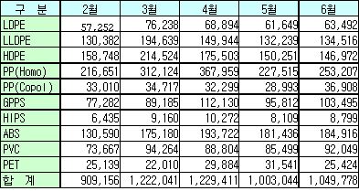 PE(Polyethylene)계 폴리머는 모두 3월 수입이 2월 대비 30% 이상 증가했는데 특히, LLDPE(Low-Linear- Density PE)는 13만382톤에서 19만4639톤으로 49.3% 증가하며 상반기 최고치를 기록했다.