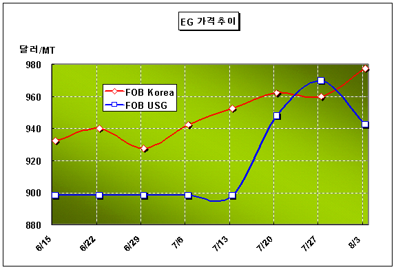 CFR Korea 978달러로 18달러 상승 … 에틸렌 코스트 상승으로 MEG 가격은 8월 첫째 주 CFR Korea 톤당 975-980달러로 18달러 상승했다.아시아 MEG(Mono-Ethylene Glycol) 시장은 수급타이트에 따라 8월 내내 강세를 지속할 것이라는 예측이 대두되면서 5월말 수준으로 복귀했다. 특히, 한국 무역상이 8월말 거래물량 3000톤을 90일 신용거래 기준으로 CFR China 970달러에 판매했다는 소문이 돌면서 상승세를 주도했다. 이에 따라 8월 거래물량은 90일 신용거래 기준으로 CFR China 985-990달러를 형성했다.