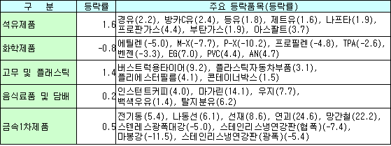 한국은행, 6월 P-XㆍM-Xㆍ에틸렌 5-10% 하락 … EGㆍPVC는 상승 2007년 7월 화학제품 생산자물가가 전월대비 0.8% 하락한 것으로 나타났다.한국은행이 발표한 <2007년 7월 생산자물가 동향>에 따르면, 2007년 7월 생산자물가는 전월대비 0.2%, 전년동월대비 2.4% 상승했다. 미국산 쇠고기 판매재개에 따른 축산물 가격하락으로 농림수산품은 0.3% 하락한 반면, 국제유가 상승으로 석유제품을 중심으로 공산품이 0.3% 오른 데다 성수기 항공 여객운임 인상과 주가 상승에 따른 위탁매매 수수료 상승 등으로 서비스 부문이 0.3% 올랐기 때문이다. 공산품은 수요부진으로 화학제품이 내렸으나 국제유가 상승으로 석유제품, 고무 및 플래스틱, 금속1차제품 등이 올라 0.3% 상승을 기록했다. 화학제품은 EG(Ethylene Glycol)이 7.0%, PVC(Polyvinyl Chloride)가 4.4%, AN(Acrylonitrile)이 4.7% 올랐지만, 중국의 재고증가, 수요부진 영향으로 에틸렌(Ethylene)이 5.0%, M-X(Mixed-Xylene)가 7.7%, P-X(Para-Xylene)가 10.2%, 프로필렌(Propylene)이 4.8%, 벤젠(Benzene)l 3.3% 내리면서 전체적으로 0.8% 하락했다.