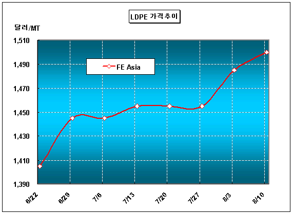 CFR FE Asia 1495-1505달러로 15달러 올라 … 에틸렌 코스트 급상승 LDPE 가격은 8월 둘째 주 CFR FE Asia 톤당 1500달러로 15달러 상승했다.아시아 LDPE(Low-Density Polyethylene) 시장은 원료인 에틸렌(Ethylene) 가격이 급상승하면서 코스트 부담이 가중되자 2007년 처음으로 1500달러를 넘어섰다. PE(Polyethylene) 가격 상승세에도 PE-에틸렌 가격 스프레드가 좁혀지고 있기 때문이다. LPPE-에틸렌 스프레드는 7월초 톤당 300달러에 달했으나 현재는 220달러 수준으로 줄어들어 가공비용 150달러를 제외하면 수익이 70달러 수준에 불과한 것으로 나타나고 있다.