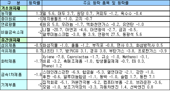 석유제품은 계절적인 수요 부진으로 프로판가스 3.9%, 부탄가스 3.8% 내렸으나 나프타(Naphtha) 1.7%, 방카C유 3.1%, 경유 3.8% 등 국제유가 상승으로 오름세를 보이면서 0.7% 상승했다. 또 섬유제품은 면사가 원면가격 상승으로 0.3% 소폭 올랐으나 대다수 제품이 원화환율 하락으로 내림세를 보이면서 0.5% 하락했다. <김 은 기자> 표, 그래프: | 기초원자재 및 중간원자재 수입물가 변화(2007. 7) | <화학저널 2007/08/14> |