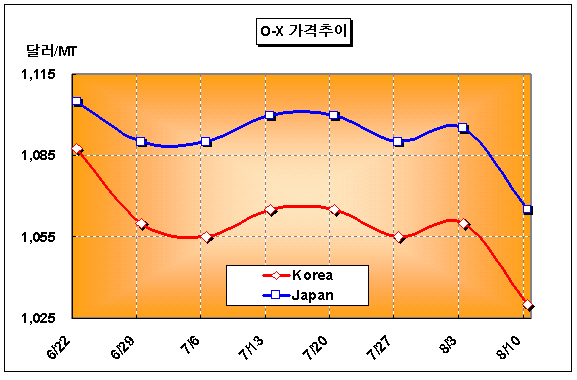 FOB Korea 1025-1035달러 형성 … PA 생산기업 재고 상당량 확보 O-X 가격은 8월 둘째 주 FOB Korea 톤당 1025-1035달러로 30달러 급락했다.아시아 O-X(Ortho-Xylene) 시장은 미국 BTX 시장의 공황으로 M-X(Mixed-Xylene) 가격이 FOB Korea 톤당 850달러로 65달러 폭락한 영향을 받아 상승세 1주일만에 하락세로 전환됐다. 이에 따라 8월 하순 거래물량 3000톤이 CFR China 톤당 1100달러에 매물로 나왔으나 구매선을 잡지 못한 것으로 알려졌다.