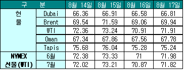 8월17일 0.23달러 상승 66.81달러 형성 … WTIㆍBrent도 올라 8월17일 국제유가는 허리케인 피해에 대한 우려가 제기되고 미국 연방준비제도 이사회가 재할인율을 인하했다는 발표에 따라 상승했다.한국석유공사에 따르면, 뉴욕상업거래소(NYMEX)의 WTI(서부텍사스 중질유) 선물유가는 전일대비 배럴당 0.98달러 상승한 71.98달러에, 런던석유거래소(ICE)의 Brent 선물유가는 0.67달러 상승한 70.44달러에 거래를 마감했다. Dubai 현물가격은 0.23달러 상승한 66.81달러를 형성했다.