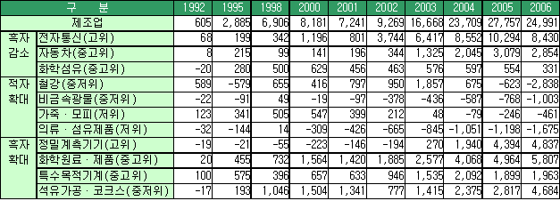 또 2005년 적자로 전환된 중ㆍ저위 기술업종인 철강제품의 적자는 22억2000만달러 확대된 것도 2006년 무역수지 흑자 감소의 주원인으로 작용한 것으로 나타났다.