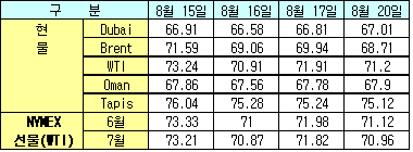 8월20일 0.20달러 상승 67.01달러 형성 … WTIㆍBrent는 하락 8월20일 국제유가는 허리케인 피해에 대한 우려가 완화되면서 하락했다.한국석유공사에 따르면, 뉴욕상업거래소(NYMEX)의 WTI(서부텍사스 중질유) 선물유가는 전일대비 배럴당 0.86달러 하락한 71.12달러에, 런던석유거래소(ICE)의 Brent 선물유가는 0.59달러 상승한 69.85달러에 거래를 마감했다. Dubai 현물가격은 0.20달러 상승해 67.01달러를 형성했다.