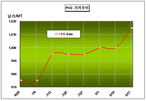 CFR FE Asia 1010-1020달러로 15달러 상승 … 러시아 PVC 가동중단 PVC 가격은 8월 셋째 주 CFR FE Asia 톤당 1015달러로 15달러 상승했다.아시아 PVC(Polyvinyl Chloride) 시장은 글로벌 수급타이트를 틈타 1000달러를 돌파한 지 2주일 만에 1020달러에 도달함으로써 2007년 들어 최고치를 기록했다. 이에 따라 일부에서는 9월 거래물량에 대해 CFR China 톤당 1020-1040달러를 요구해 8월 990-1000달러를 훌쩍 넘어섰다. 국제적으로 PVC 수급타이트가 지속되고 있기 때문으로, 중국기업들도 CFR China 1020달러를 받아들인 것으로 알려졌다.