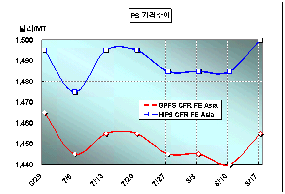CFR China 1450-1460달러 … 수익악화로 가동률 감축 지속될 듯 GPPS(General-Putpose Polystyrene) 가격이 8월 셋째 주 CFR SE Asia 톤당 1470-1480달러, CFR China 톤당 1450-1460달러를 형성했다.HIPS(High-Impact PS) 가격은 CFR SE Asia 톤당 1510-1520달러, CFR China 톤당 1495-1505달러를 형성해 소폭의 상승세를 나타냈다. 원료인 SM(Styrene Monomer) 가격이 CFR China 톤당 1360-1370달러로 강보합세를 유지하고 있어 PS 생산기업들은 거의 한 달 가량 15-30달러 정도 적자를 겪은 것으로 알려졌다. GPPS 거래가격은 SM 가격보다 100달러 이상에서 형성돼야 수익을 남길 수 있기 때문에 PS 생산기업들은 최소한의 수익성을 남기기 위해 가격을 CFR China 톤당 1465-1490달러 수준으로 올린 것으로 분석된다.