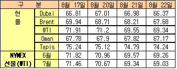 8월22일 0.61달러 하락 66.37달러 … WTI 하락에 Brent 소폭 상승 8월22일 국제유가는 미국 원유 재고 증가에 따라 하락했다.한국석유공사에 따르면, 뉴욕상업거래소(NYMEX)의 WTI(서부텍사스 중질유) 선물유가는 전일대비 배럴당 0.31달러 하락한 69.26달러에, 런던석유거래소(ICE)의 Brent 선물유가는 0.01달러 상승한 68.70달러에 거래를 마감했다. Dubai 현물가격은 0.61달러 하락해 66.37달러를 형성했다.