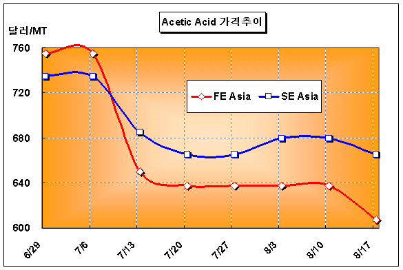 CFR FEA 605-610달러로 20달러 하락 … Celanese 120만톤 재가동 아시아 초산(Acetic Acid) 가격은 8월 셋째 주 CFR FE Asia 톤당 605-610달러를 형성해 30달러 하락했다.중국의 초산 내수가격 하락으로 동북아시아 시장이 침체되고 있기 때문이다. 동남아 초산 가격은 비교적 높게 형성돼 CFR SE Asia 톤당 660-670달러로 15달러 하락에 그쳤고, 서남아시아에서는 CFR S Asia 톤당 680-690달러로 10달러 하락했다.