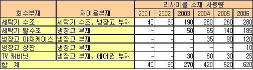 2001년에는 세탁기 수조로부터 재생한 재료 40톤을 같은 수조 등 부재 제조에 이용하고 이후에도 세탁기 탈수조, Balancer, 냉장고 야채케이스, TV 캐비닛으로 회수부재의 대상을 확대했다. 2006년에는 회수부재 용도에 냉장고 선반도 포함시켜 사용량을 총 620톤으로 확대했다. 2006년 목표는 세탁기 수조 260톤, 탈수조ㆍBalancer 160톤, 냉장고 야채케이스 160톤, TV 캐비닛 20톤 등 600톤이었다. Sharp는 2007년 800톤, 2008년 1000톤을 목표로 하고 있다. 폴리유산과의 블랜드에서는 PP와 나란히 구성비율이 높은 PS 및 ABS(Acrylonitrile Butadiene Styrene) 블랜트 기술개발에 성공했다. 화학기업의 협력을 얻어 상용 화학제품을 최적화한 것으로, 폴리유산의 과제였던 내구성, 재생성, 형성성 등을 범용 플래스틱 수준으로 개선했다. 개발제품은 항장력 강도, 완곡강도 등 기본적인 특성이 ABS를 웃도는 것으로 나타났고 10년 정도의 장기안정성도 확보했다. Sharp는 현재 냉장고 얼음통, 액정 텔레비전 스피커그릴 등의 치수안정성 등을 시험하고 있으며 크게 기대하고 있다. 특히, PP와의 블랜드에서도 폴리유산의 가격, 공급을 예상하면서 2007년 채용을 결정했다. 자기순환형 Material Recycle은 식물에서 유래돼 소각 이후에도 Carbon Neutral에 비중을 두지 않고 식물계, 리사이클계에 대처 가능한 새로운 석유화학 자원으로 부상하고 있다. 표, 그래프: | Sharp의 자기순환형 Material Recycle 추이 | <화학저널 2007/08/24> |