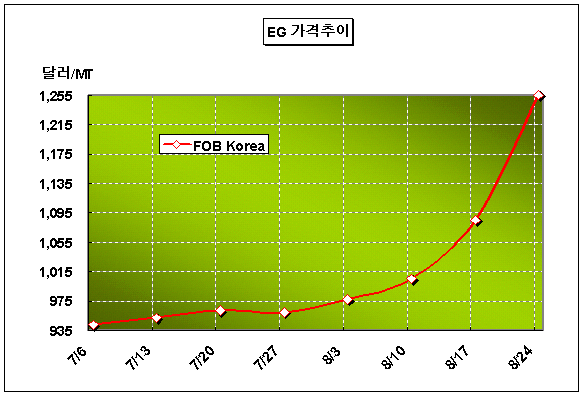 CFR China 1250-1260달러 형성 … MEGlobal 플랜트 트러블로 MEG 가격은 8월 넷째주 CFR China 톤당 1250-1260달러로 170달러 폭등했다.아시아 MEG(Monoethylene Glycol) 시장은 9월 상순 거래물량이 무역상과 유통상 사이의 거래에 차질이 발생함에 따라 2007년 들어 최고가격을 형성했다. 지난 주 초반에는 9월 중순 거래물량이 90일 신용거래 기준 CFR China 톤당 1140-1150달러를 형성한 후 주중에는 1170-1200달러로 상승했고, 주말에는 1220-1230달러를 기록했다. 일부에서는 9월 중순 거래물량이 90일 신용거래 기준 CFR China 톤당 1300달러를 형성하기도 했다.
