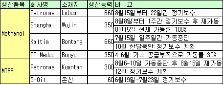 8월6일 발생한 예기치 못한 기계적 트러블 때문으로, 5일간 플랜트 가동을 중단했고 2007년 말 정기보수에 들어갈 예정이다. S-Oil은 6월19일부터 온산 소재 MTBE 6만톤 플랜트의 정기보수를 실시하고 있다. 표, 그래프: | 아시아 메탄올ㆍMTBE 플랜트 가동현황(2007) | <화학저널 2007/08/27> |