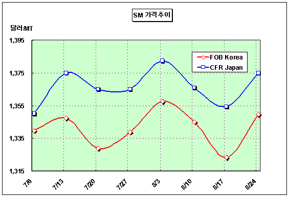 FOB Korea 1349-1350달러로 27달러 올라 … 4만톤 유입이 관건 SM 가격은 8월 넷째주 FOB Korea 톤당 1350달러로 27달러 상승했다.아시아 SM(Styrene Monomer) 시장은 국제유가와 3주일 동안 강보합세에 머물고 원료 벤젠(Benzene) 가격이 FOB Korea 톤당 980달에 머무르고 있음에도 1350달러로 상승했다. 벤젠 약세에도 불구하고 에틸렌(Ethylene) 가격이 FOB Korea 톤당 1200달러 후반으로 강세를 지속해 아시아 SM 플랜트 가동률이 낮은 수준에 머무르고 있기 때문으로 해석된다. 그러나 미국과 유럽에서 거대물량이 아시아를 향하고 있어 곧바로 하락세로 전환될 것이 확실시되고 있다. 미국산 1만톤과 유럽산 3만톤이 9-11월 도착 예정으로 아시아를 향하고 있기 때문이다.