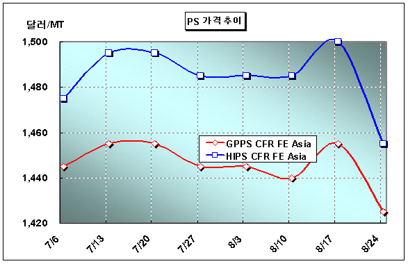 여기에 중국 정부가 8월23일부터 PS 가공제품에 대해 수출증치세 환급률을 50% 인하한 것도 영향을 미치고 있다. 표, 그래프: | PS 가격추이 | <화학저널 2007/08/29> |