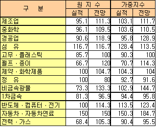 내수(117.8)를 비롯해 수출(106.6), 투자(105.6), 고용(102.1), 자금사정(100.9)에서 호조 지속을 전망했으나 재고(103.6)는 전월대비 다소 증가할 것으로 나타났다. 매출액을 감안한 가중지수에서도 9월 전망치는 112.7로 호전될 것으로 전망했다. 8월 실적 BSI는 94.4로 철강, 비철금속, 펄프 및 종이 등 일부 업종의 매출 부진에 따른 자금사정 악화로 제조업(95.1), 비제조업(93.4) 모두 전월대비 다소 부진했으나 계절조정 실적치는 103.9로 호전된 것으로 응답했다. 경공업(118.9)은 음식료(128.0), 나무ㆍ목재(125.0), 섬유(116.7), 의복ㆍ가죽ㆍ신발(109.1)이 전월대비 호전을, 고무ㆍ플래스틱(100.0)은 전월과 유사한 경기를 보였고 8월 실적(95.8)은 음식료, 의복ㆍ가죽ㆍ신발을 중심으로 부진한 경기를 보였다.. 중화학공업(109.5)은 비금속광물(133.3), 선박ㆍ철도ㆍ항공기(133.3), 펄프ㆍ종이(120.0), 조립금속ㆍ기계(113.0), 제약ㆍ화학제품(104.7)이 호전을, 의료ㆍ정밀ㆍ과학기기(100.0)는 전월과 유사한 경기를, 일차금속(96.9), 자동차ㆍ트레일러(92.3), 철강(91.3), 정유(80.0)은 경기부진을 전망했다. 중화학공업 8월 실적(96.1)은 일차금속, 비금속광물 등을 중심으로 소폭 부진한 경기를 보였다. 또 비제조업(112.6) 중 자동차판매ㆍ자동차연료(150.0), 전력ㆍ가스(105.3)는 호전을 전망했다. <김 은 기자> 표, 그래프: | 기업체감경기 현황(2007.9) | <화학저널 2007/08/29> |