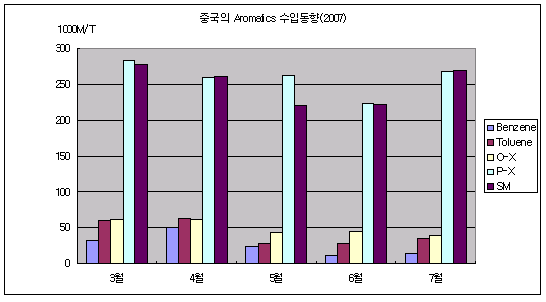 SM(Styrene Monomer)도 4월 26만1779톤에서 5월 22만463톤으로 감소한 후 6월 22만1032톤으로 증가했고 7월에는 4월 수준을 회복한 26만9153톤이 수입됐다. 한편, O-X(Ortho-Xylene)는 4월 6만톤 수준에서 5월 4만3040톤으로 급격히 감소한 후 6월 4만4211톤으로 소폭 증가했지만 7월 3만8904톤으로 감소했다. <이선애 기자> 표, 그래프: | 중국의 Aromatics 수입동향(2007) | <화학저널 2007/08/30> |