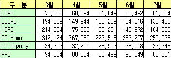 HDPEㆍLLDPE 5월 이후 회복세 … LDPEㆍPVC는 감소세 중국의 폴리머(Polymer) 수입이 3월 이후 감소세를 면치 못하고 있다.4월부터 아시아의 주요 석유화학 플랜트들이 정기보수로 5월 수입이 크게 감소한 후 6월에는 소폭 증가세로 돌아섰으나 7월 다시 하향세를 나타냈다. 중국의 폴리머 생산기업들이 속속 정기보수를 마치고 정상가동에 들어갔기 때문인 것으로 분석된다.