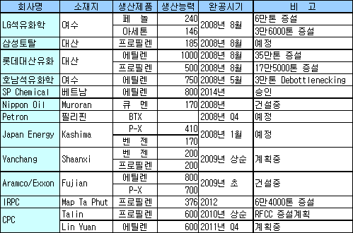 2008년 하반기부터 아시아의 올레핀(Olefin), BTX(BenzeneㆍTolueneㆍXylene)는 물론 아세톤(Acetone) 및 페놀(Penol) 등의 증설이 줄줄이 예정돼 있어 석유화학 시장규모가 확대될 전망이다.