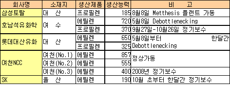 롯데대산유화는 에틸렌 65만톤 및 프로필렌 35만톤 크래커를 5월8일부터 한달간 Debottlenecking했다. 표, 그래프: | 국내 올레핀 플랜트 가동현황(2007) | <화학저널 2007/08/31> |