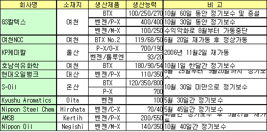 Nippon Oil은 Negishi 소재 벤젠 14만톤 및 M-X(Mixed-Xylene) 35만톤 플랜트의 정기보수를 10월 40일간 실시할 계획이다. <이선애 기자> 표, 그래프: | 아시아 BTX 플랜트 가동현황(2007) | <화학저널 2007/09/03> |