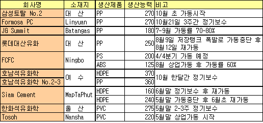 호남ㆍFormosa만 10월 정기보수 … 삼성토탈은 10월 27만톤 가동 Formosa가 10월21일부터 3주간 PP(Polypropylene) 27만톤 플랜트의 정기보수에 들어갈 계획이다.호남석유화학도 여수 소재 HDPE(High-Density Polyethylene) 37만톤 플랜트와 PP 36만톤 플랜트를 10월 한달간 정기보수한다. 반면, 삼성토탈은 대산 소재 PP 27만톤 플랜트를 10월 초 가동할 예정이고, 롯데대산유화는 8월9일 저장탱크 폭발로 가동을 중단했던 PP 25만톤 플랜트를 8월12일 재가동했다. FCFC는 중국 Ningbo 소재 PS(Polystyrene) 20만톤 플랜트를 4/4분기에 가동할 예정이고, ABS(Acrylonitrile Butadiene Styrene) 12만5000톤 플랜트는 8월 가동을 시작했으나 가동률이 60%에 그치고 있다.