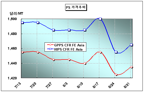 CFR FE Asia 1430-1440달러 형성 … Yangzi-BASF 가동률 감축 GPPS 가격은 8월 다섯째 주 CFR FE Asia 톤당 1435달러로 10달러 상승했다.아시아 PS(Polystyrene) 시장은 원료가격 강세로 수익성이 악화돼 가동률 감축이 이어짐에 따라 약상승해 1440달러 수준을 회복했다. GPPS(General Purpose PS)는 100톤이 한때 CFR China 톤당 1450-1460달러에 거래되기도 했으나 구매처가 없어 곧 하락했다. HIPS(High Impact PS) 역시 일부에서 CFR China 톤당 1490-1500달러를 요구했으나 보통 1475달에 오퍼를 내 1460-1470달러를 형성했다.