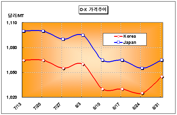 중국 동부지역의 O-X 내수가격은 ex-Tank 톤당 9500위안으로 수입가격 기준 1050달러를 형성하며 안정된 모습을 보였다. 표, 그래프: | O-X 가격추이 | <화학저널 2007/09/07> |