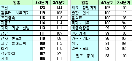 상의, 4/4분기 EPI 106으로 상승세 … 석유화학 107에 정유 111 실물경기가 완만한 회복세를 보이고 있는 가운데 제조기업의 고용증가세도 지속될 것으로 전망됐다.대한상공회의소가 전국 제조기업 1564사를 대상으로 실시한 <2007년 4/4분기 고용전망지수>에 따르면, 4/4분기 고용전망지수(EPI)는 106으로 1/4분기 103에 이어 꾸준한 상승세를 이어갈 것으로 나타났다. 특히, 벌크선 고급 선박 물량출하가 늘고 있는 조선업종(123), 솔루션ㆍ컨설팅 비중을 확대하고 있는 컴퓨터ㆍ사무기기 업종(119), 자동차산업 호황에 힘입은 조립금속업종(116) 등의 고용이 크게 늘어날 것으로 전망됐다. 화학업종에서는 석유화학이 97에서 107로, 정유가 107에서 111로 크게 증가할 것으로 예상됐고 고무ㆍ플래스틱은 112에서 109로 소폭 축소될 것으로 조사됐다. 반면, 의복ㆍ모피(89), 섬유(91) 등은 중국산 저가제품의 국내외 시장잠식 등의 원인으로 고용이 축소될 전망이다.