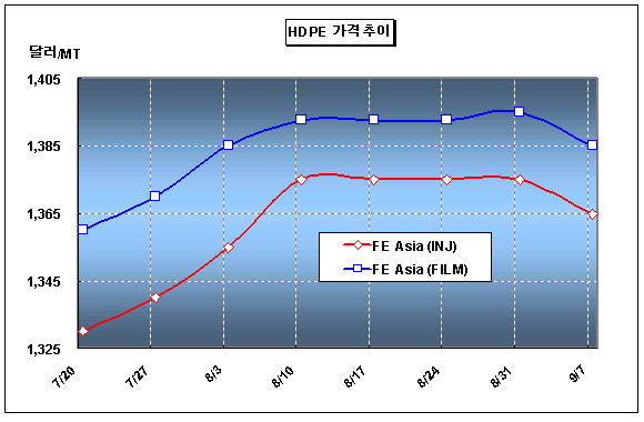 CFR FE Asia 1360-1370달러로 10달러 하락 … 10월 추가하락 예고 HDPE 가격은 9월 첫째 주 Injection 그레이드 기준 CFR FE Asia 톤당 1365달러로 10달러 하락했다.아시아 HDPE(High-Density Polyethylene) 시장은 중국이 10월 장기간의 연휴에 들어감에 따라 수요가 감소할 것으로 예상되면서 하락세로 전환했다. 특히, Film 그레이드 HDPE는 1400달러를 돌파할 수도 있다는 예측이 지배적이었으나 1380-1390달러로 떨어졌다. 국내 HDPE 생산기업은 9월 중남미 수출가격으로 FOB Korea 톤당 1410-1420달러를 받은 것으로 알려졌다.