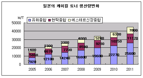 분말 토너에서 케미컬 토너로 전환되면서 케미컬 토너 비율이 꾸준히 상승해 2011년에는 29.5%로 30%대에 육박할 것으로 예상된다. 일본의 토너용 레진 시장은 2006년 11만1900톤으로 Styreneㆍ아크릴(Acryl)계가 51.5%를 차지하고 있지만 2011년까지는 폴리에스테르(Polyester)계가 추격할 것으로 예측되고 있다. 표, 그래프: | 일본의 케미컬 토너 생산량변화 | <화학저널 2007/09/11> |