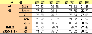 9월10일 0.32달러 상승 71.45달러 형성 … WTIㆍBrent도 상승 지속 9월10일 국제유가는 OPEC(석유수출국기구)가 9월11일 정기 총회에서 증산하지 않을 것이라는 전망 등으로 상승했다.한국석유공사에 따르면, 뉴욕상업거래소(NYMEX)의 WTI(서부텍사스 중질유) 선물유가는 전일대비 0.79달러 상승한 77.49달러에, 런던석유거래소(ICE)의 Brent 선물유가는 0.41달러 상승한 75.48달러에 거래를 마감했다. Dubai 현물가격은 0.32달러 상승해 71.45달러를 형성했다.