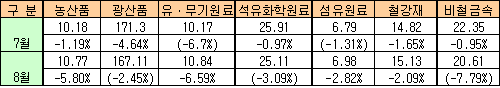 8월 KOIMA 지수 4.98p 하락 256.55p 기록 … 비철금속 7.79% 하락 2007년 들어 상승세를 이어가던 원자재 수입가격이 잠시 주춤해졌다.한국수입업협회(KIIMA)가 9월11일 발표한 수입원자재 가격동향에 따르면, 원자재 수입가격 지수인 2007년 8월 KOIMA 지수는 7월보다 4.98p 하락한 256.55p를 기록했다. 8월 원자재 수입가격은 서브프라임 쇼크로 불안한 금융시장 분위기속에 약세를 거듭한 비철금속(7.79%)이 가장 크게 하락했으며, 미국과 OPEC(석유수출국기구)의 생산량 증가소식으로 안정을 찾은 광산품(2.45%)과 석유화학 원료(3.09%)가 뒤를 이었다. 반면, 그동안 약세를 보여 왔던 유ㆍ무기원료(6.59%)가 제한적인 공급에 비해 수요증가로 크게 올랐다. 또 최근 강세를 보이고 있는 농산품(5.8%)은 곡물 수요증가, 기상이변에 다른 생산량 감소, 곡물을 원료로 한 바이오연료산업의 성장으로 수요가 늘어나면서 상승했다. 섬유원료(2.82%)는 공급차질과 수요증대로 소폭 상승했고 철강재(2.09%)가 뒤를 이었다.