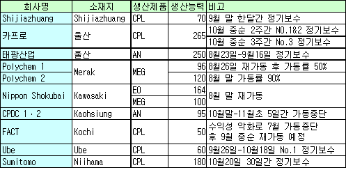 9월16일까지 정기보수 완료 예정 … 카프로는 10월 CPL 정기보수 아시아의 합섬원료 플랜트 정기보수가 2007년 하반기에 활발할 전망이다.카프로는 10월 중순 울산 소재 CPL(Caprolamtam) No.1&2 플랜트는 2주간, No.3 플랜트는 3주간 각각 정기보수를 계획하고 있고, 중국 Shijiazhuang은 CPL 8만톤 플랜트를 9월 말부터 한달간 정기보수에 들어갈 계획이다. FACT는 Kochi 소재 CPL 플랜트를 수익성 악화로 7월 가동중단한 후 9월 중순부터 가동을 재개할 예정이고, Ube는 9월말 No.1 플랜트를 정기보수할 계획이며, Sumitomo도 10월20일부터 정기보수를 계획하고 있다.