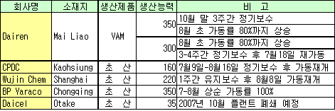 10월 말 35만톤 플랜트 가동중단 … 초산은 8월부터 속속 가동재개 타이완의 Dairen Chemical이 10월 말부터 3주간 Mai Liao 소재 VAM(Vinyl Acetate Monomer) 35만톤 플랜트의 정기보수를 실시한다.미국 및 유럽의 VAM 플랜트 트러블로 메이저들이 연이어 불가항력을 선언해 수급타이트 현상이 지속되고 있는 상황에서 Dairen이 정기보수를 계획하고 있어 북미ㆍ유럽에 이어 아시아도 타이트한 상황이 당분간 지속될 전망이다.