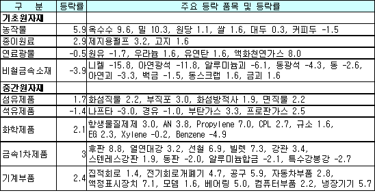 섬유제품은 주로 환율 상승에 따라 1.7% 올랐고 금속1차제품은 비철금속소재는 하락했으나 후판, 선철 등 철강재가 중국의 수요 증가 및 증치세 환급률 축소 영향으로 오름세를 보이면서 3.0% 상승했다. <김 은 기자> 표, 그래프: | 기초원자재 및 중간원자재 수입물가 변화(2007.8) | <화학저널 2007/09/17> |