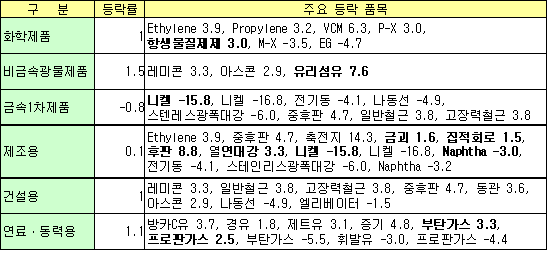 원재료는 유럽의 밀 작황부진, 선박운임 상승 등에 따른 수입농산물 가격 상승으로 농림수산제품이 올랐으나, 미국의 신용경색에 따른 경기둔화 우려로 국제원자재 가격이 하락함에 따라 광산품이 내려 0.2% 하락했다. <김 은 기자> 표, 그래프: | 중간재 물가 상승률(2007.8) | <화학저널 2007/09/17> |