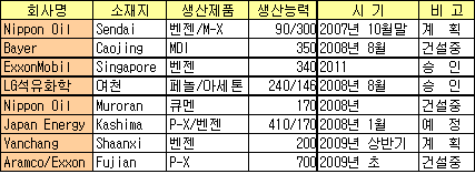 LG석유화학은 여천 소재 페놀(Phenol) 및 아세톤(Acetone)을 각각 6만톤, 3만6000톤 확대할 계획인 것으로 나타났다. <이선애 기자> 표, 그래프: | 아시아 BTX 신증설 현황(2007) | <화학저널 2007/09/21> |