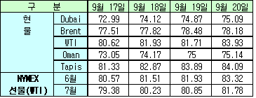 9월20일 0.22달러 상승 75.09달러 형성 … WTIㆍBrent도 상승 9월20일 국제유가는 미국 멕시코만의 열대성 폭풍에 따른 원유생산 차질이 발생하면서 상승했다.한국석유공사에 따르면, 뉴욕상업거래소(NYMEX)의 WTI(서부텍사스 중질유) 선물유가는 전일대비 1.39달러 상승한 83.32달러에, 런던석유거래소(ICE)의 Brent 선물유가는 0.62달러 상승한 79.09달러에 거래를 마감했다. Dubai 현물가격은 0.22달러 상승해 75.09달러를 형성했다.