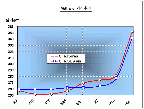 메탄올 가격은 9월 넷째 주 CFR Korea 톤당 355달러로 70달러 폭등했다.