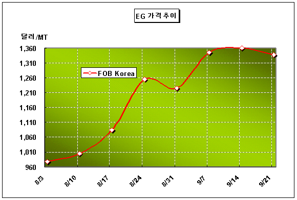 CFR China 1338달러로 22달러 하락 … Nanya 36만톤 플랜트 재가동 MEG 가격은 9월 넷째 주 CFR China 톤당 1335-1340달러로 22달러 떨어졌다.아시아 MEG(Mono-Ethylene Glycol) 시장은 SABIC이 10월 아시아 계약가격을 CFR 톤당 1275달러로 고시한데 영향을 받아 강세를 접고 하락세로 전환됐다. 이에 따라 9월말 거래되는 2000-3000톤이 90일 신용거래 기준으로 CFR China 1300달러를, 또다른 2000톤은 1320달러를 형성했다.