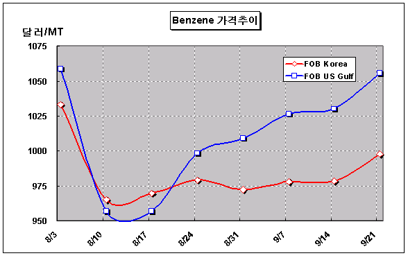 FOB Korea 997-998달러로 20달러 상승 … 미국은 1056달러 형성 벤젠 가격은 9월 넷째 주 FOB Korea 톤당 998달러로 20달러 상승했다.아시아 벤젠(Benzene) 시장은 국제유가가 WTI(서부텍사스 중질유) 배럴당 84달러 수준으로 상승하고 미국가격까지 초강세를 보임에 따라 1000달러에 근접했다. 특히, 11월 거래물량은 CML이 FOB Korea 톤당 1000달러, BP가 1010달러를 나타내 1000달러를 넘어선 것으로 알려졌다.