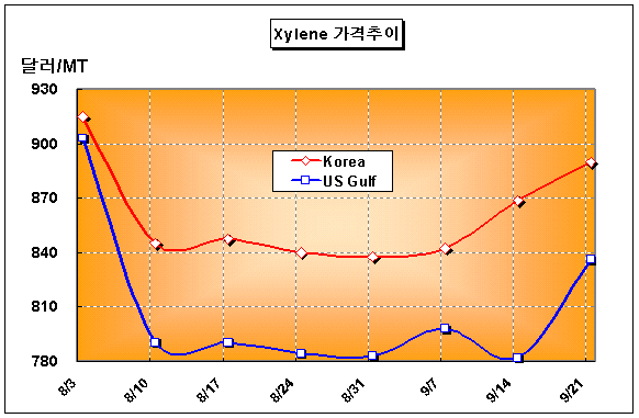 FOB Korea 890-891달러로 21달러 상승 … 미국은 836달러로 급등 자일렌 가격은 9월 넷째 주 FOB Korea 톤당 890달러로 21달러 상승했다.아시아 자일렌(Xylene) 시장은 국제유가가 Dubai유 기준 배럴당 75달러를 넘어서면서 코스트가 크게 올라 오랜만에 900달러에 육박했다. 이에 따라 KP케미칼은 11월 거래가격으로 FOB Korea 톤당 890달러에서 896달러 사이를 요구한 것으로 알려졌다.