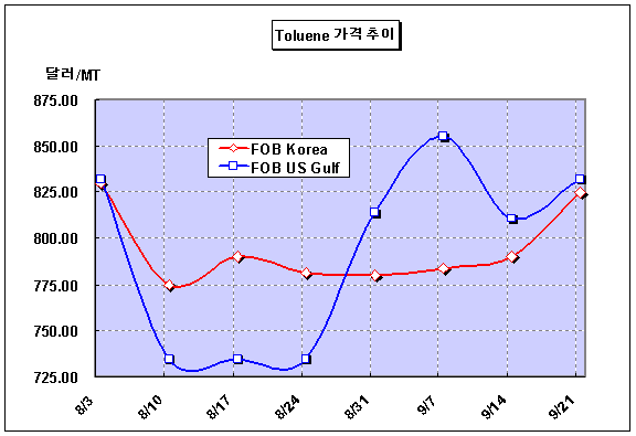 FOB Korea 824-825달러 형성 … 중국 동부는 공급과잉 지속 톨루엔 가격은 9월 넷째 주 FOB Korea 톤당 824-825달러로 35달러 상승했다.아시아 톨루엔(Toluene) 시장은 공급과잉이 해소되지 않고 있음에도 불구하고 국제유가 폭등 및 미국가격 강세의 영향을 받아 800달러를 훌쩍 넘어섰다. 중국 내수가격은 동부지역의 재고가 6만5000-7만5000톤으로 넘쳐나면서 ex-Tank Zhangjiagang/Jiangyin 톤당 7250위안을 형성했다.