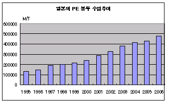 비닐봉투 감축에 적극적인 대형 슈퍼마켓이 대부분 수입제품에 의존하고 있어 앞으로 수입량은 더욱 마이너스가 될 것으로 예상되고 있다. 슈퍼마켓 등에서 나눠주는 비닐봉투는 최근 환경문제 고조에 따라 세계적으로 사용량을 감축하고 있는 추세이다. 일본에서는 2007년 실시된 용기포장 리사이클법 개정으로 소매업자들의 배출억제 촉진이 의무화됐다. 이에 따라 전국 체인망을 보유하고 있는 대형 슈퍼마켓 등은 비닐봉투 감축 목표를 설정해 일부에서는 유료화를 도입하는 등 대책마련이 잇따르고 있다. 또 환경문제에 대한 관심이 높은 주부 등 소비자들도 장바구니 지참 등의 의식이 고조되면서 최근 비닐봉투 사용 억제효과가 나타나기 시작했다. 일본의 PE 봉투 사용량은 1980년대 연평균 5만톤 이하에서 1990년대부터 급격히 증가했다. 중국과 동남아시아 등 인건비가 싼 지역의 수지가공업과 PE 봉투업이 성장하면서 대형 슈퍼마켓 등이 비닐봉투를 저가 수입제품으로 대체했기 때문이다. 2006년 비닐봉투 약 60만톤 중 40만톤이 수입제품으로 추정되고 있다. 폴리올레핀(Polyolefin) 생산기업들도 2007년 상반기 정체상태는 이미 정점에 달했기 때문이라고 보고 앞으로는 감소할 가능성이 높다고 판단해 8월 이후 수입을 주목하고 있다. 표, 그래프: | 일본의 PE 봉투 수입추이 | <화학저널 2007/10/1> |